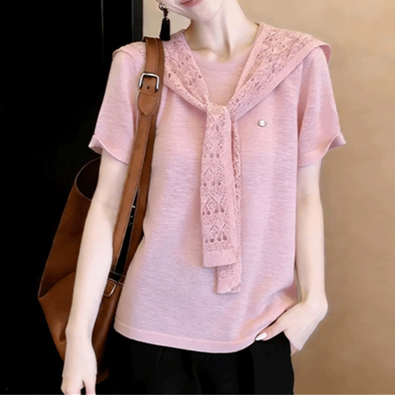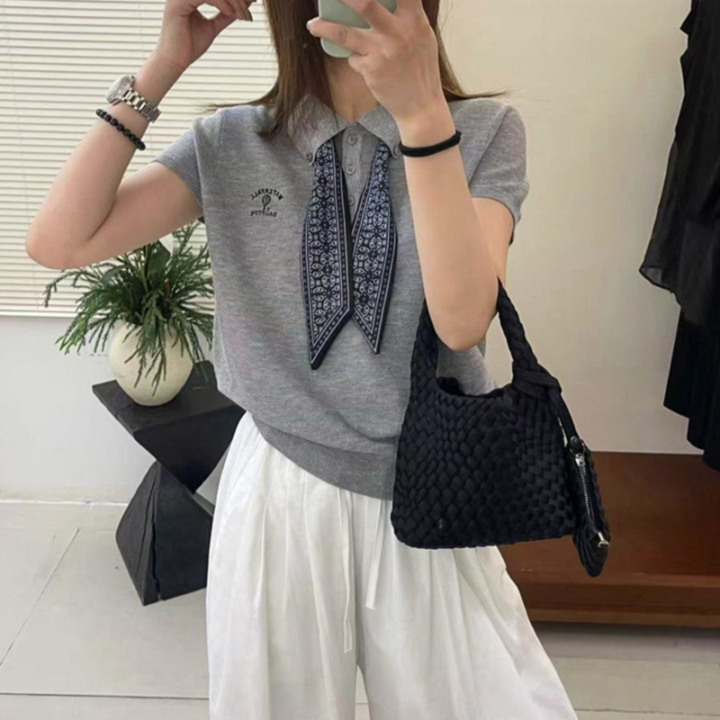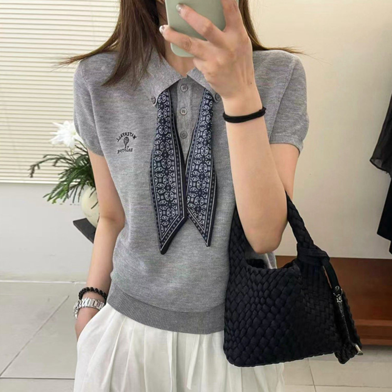 Summer gray loose pullover short-sleeved women's knitted top with silk scarf