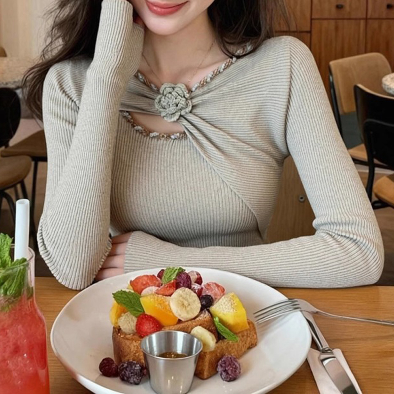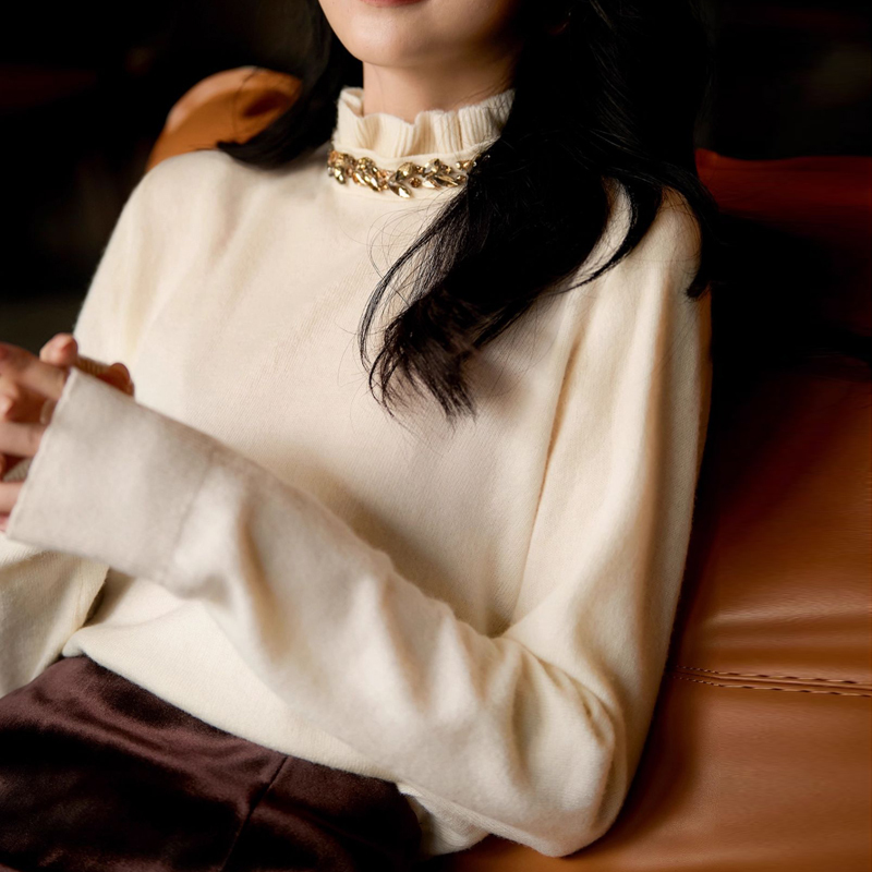 Elegant fungus edge and diamond-encrusted neckline pullover sleeves autumn and winter sweater