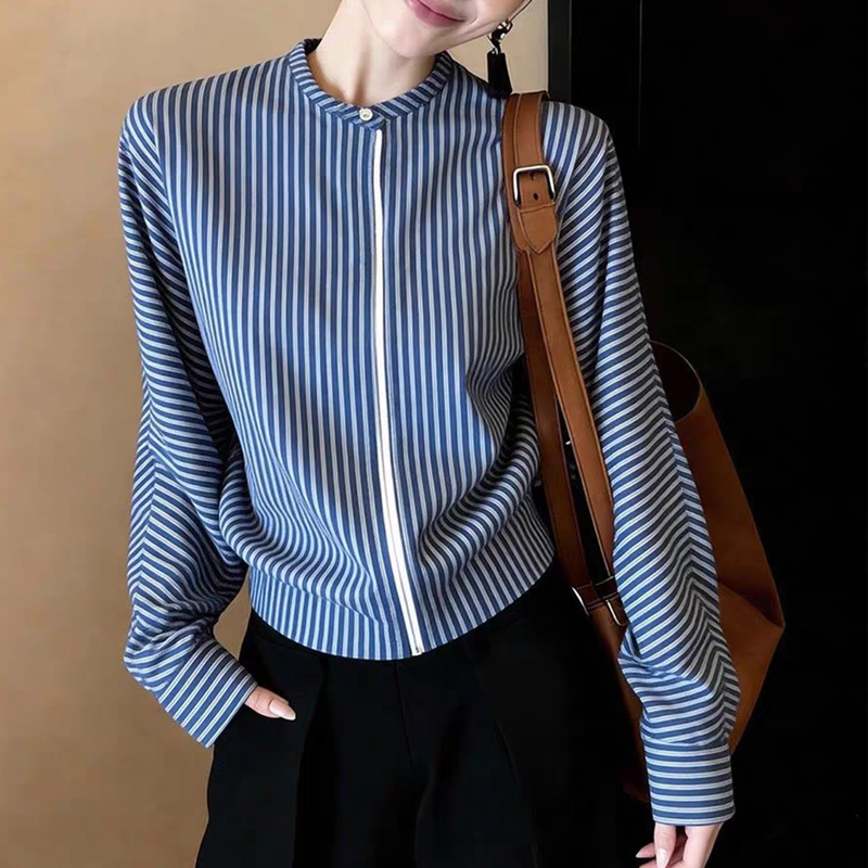 Blue vertical stripe casual chic sleeves women's shirt top