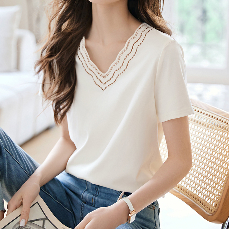 Design sense wave embroidery V-neck short-sleeve women's t-shirt