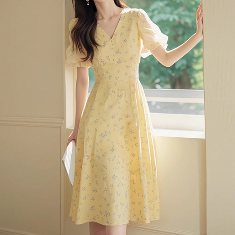 Yellow color V-neck waist waist, platycodon skirt, short-sleeved dress