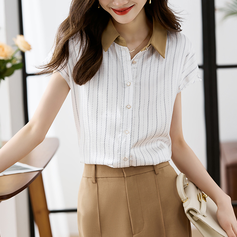 Commuting contrasting collar summer vertical stripe short-sleeved women's shirt