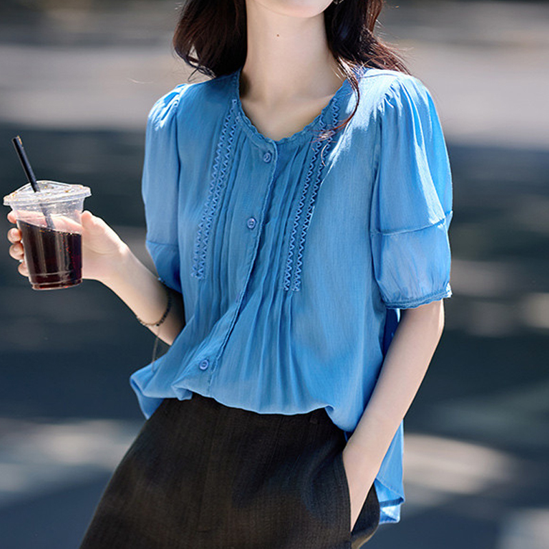 Blue pleated lace stitching loose short-sleeved women's shirt