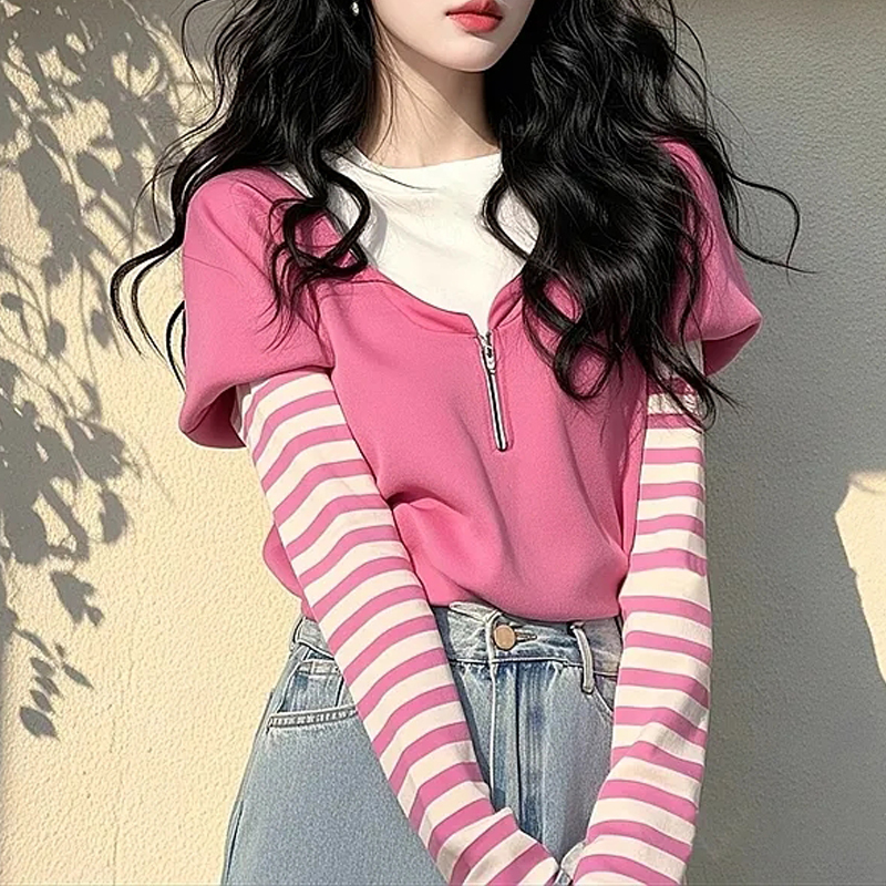 Summer pink gentle style stitching new short-sleeved women's t-shirt top