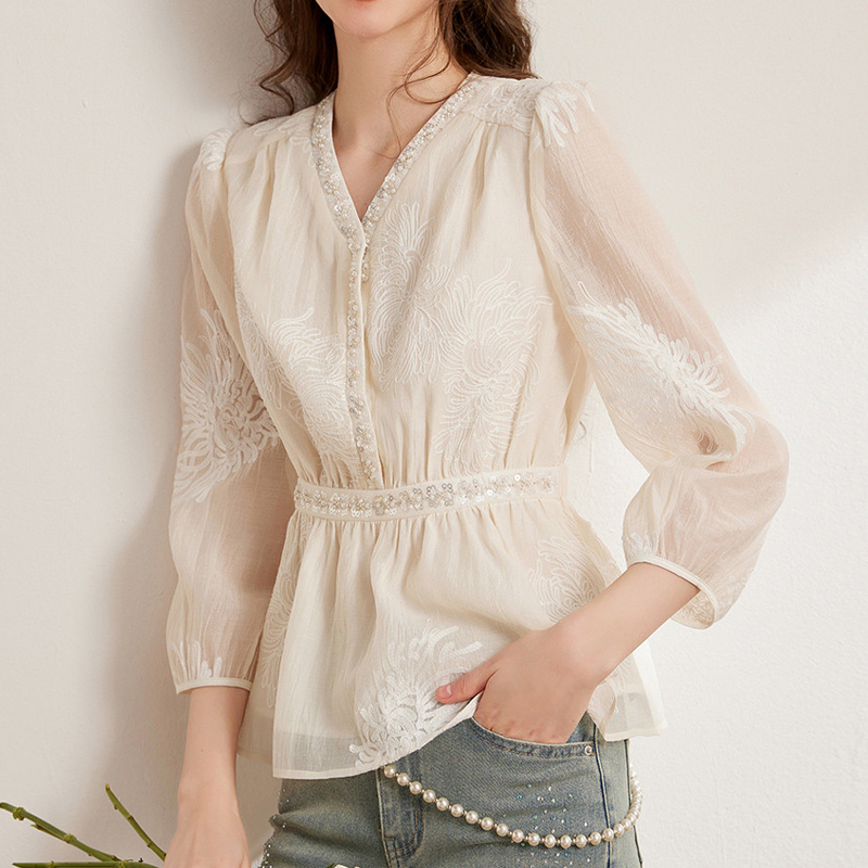 French design hollowed-out collar long-sleeved shirt