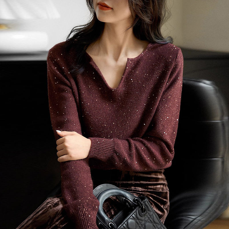 Lazy style sequined red pullover small V-neck pullover sleeves women's sweater