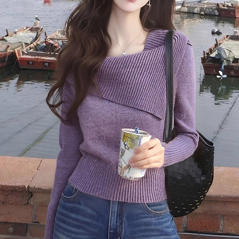 Irregular lapel design pullover slim sleeve sweater