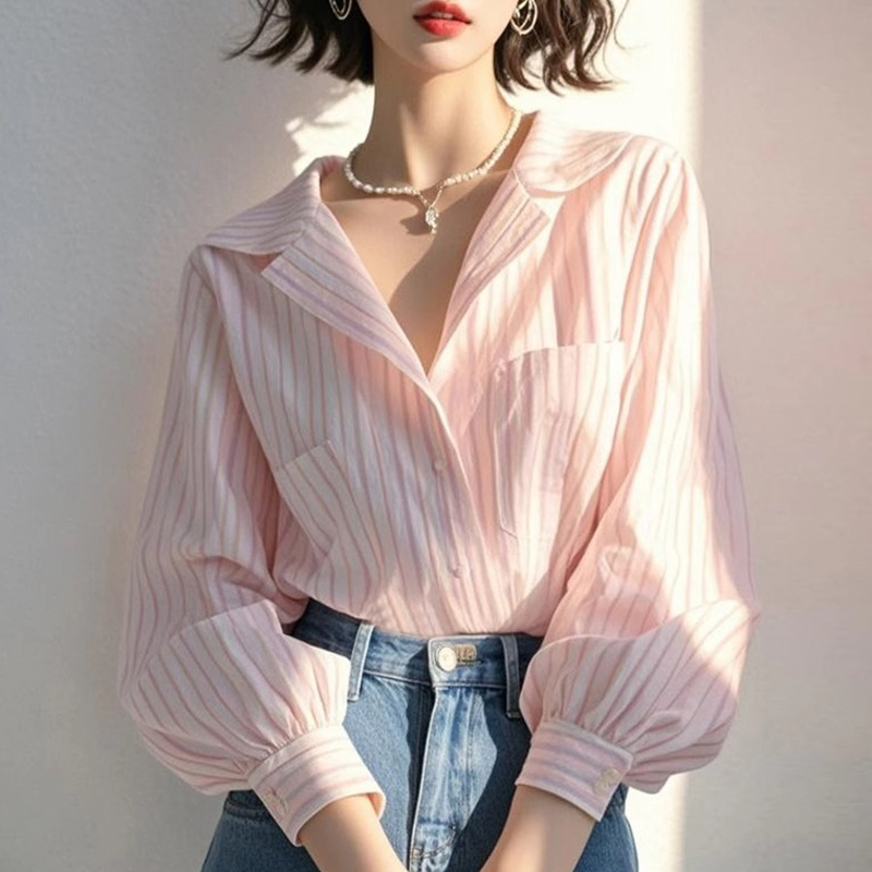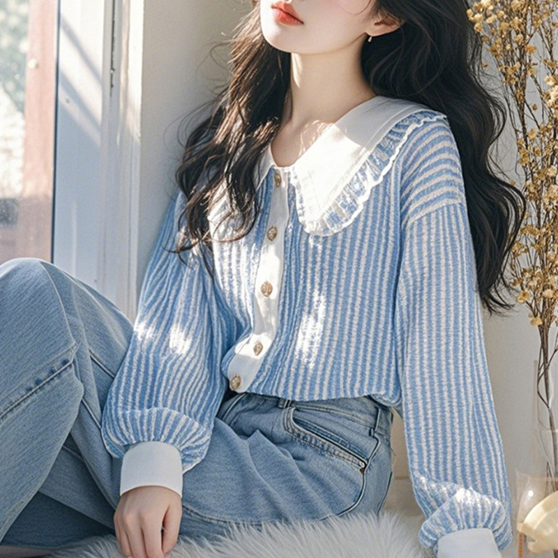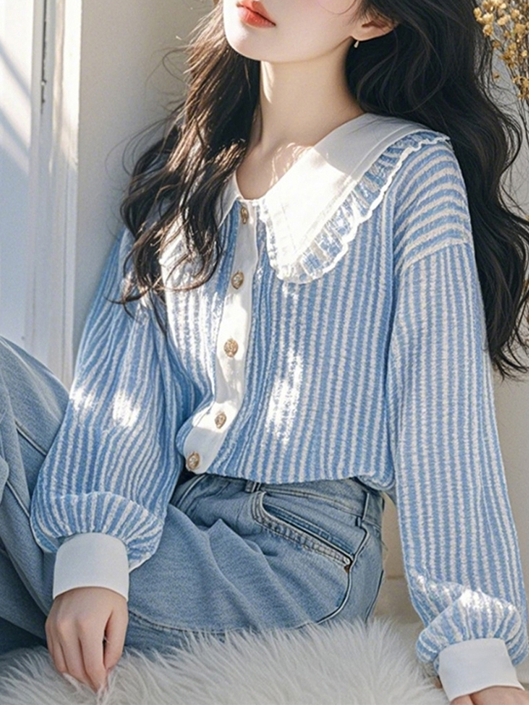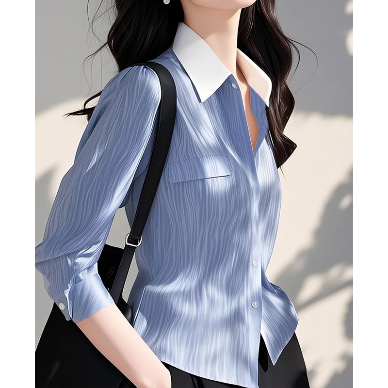 Contrasting blue and white stripe new style temperament commuting sleeve women's shirt