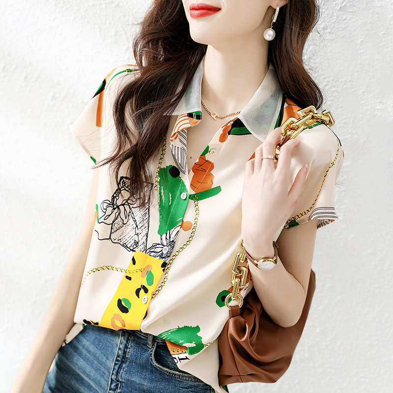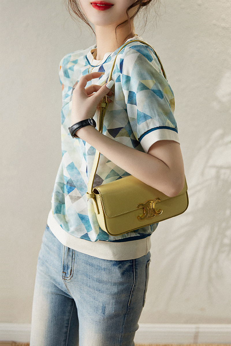 Abstract printed Augen yarn square collar short-sleeved blouse