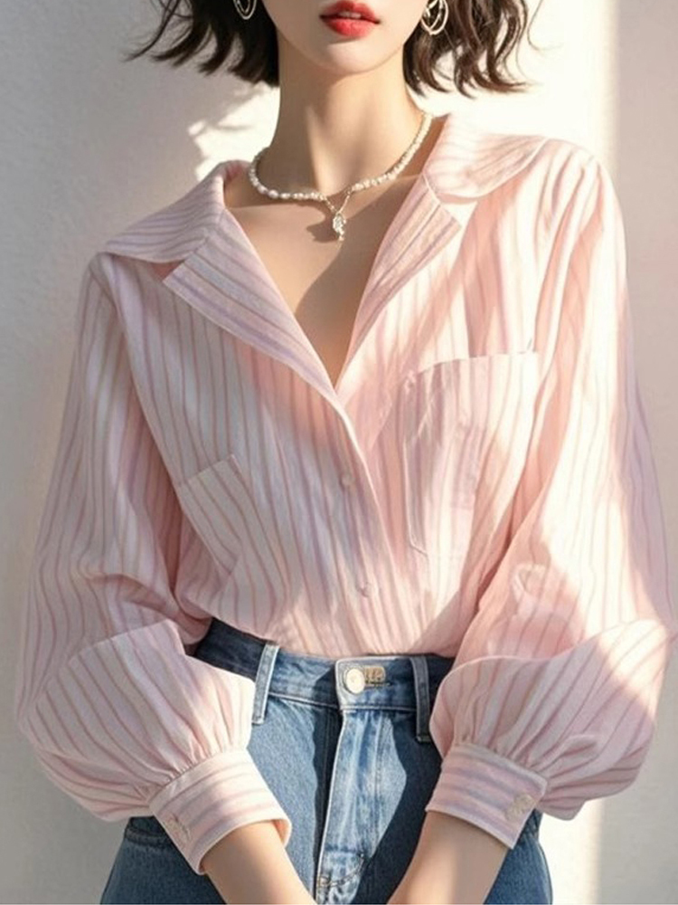Contrasting lapel blue vertical stripe commuting sleeve blouse