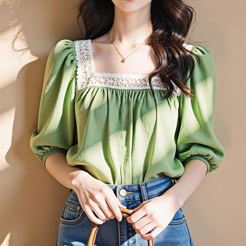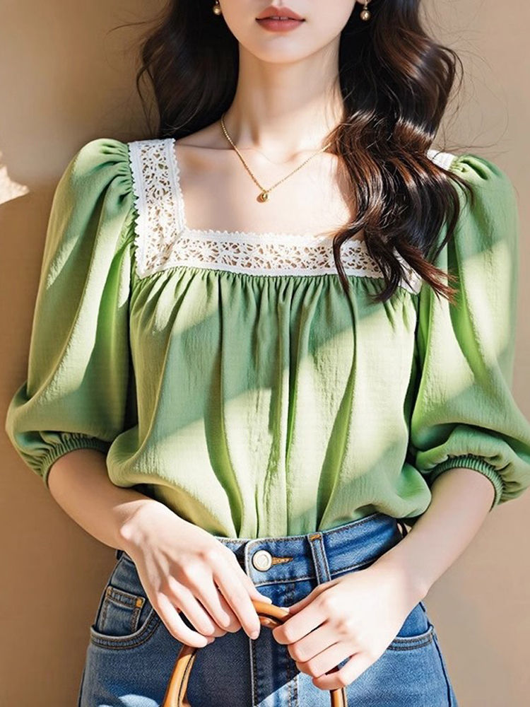 Contrast-color lace square collar pullover green short-sleeved blouse