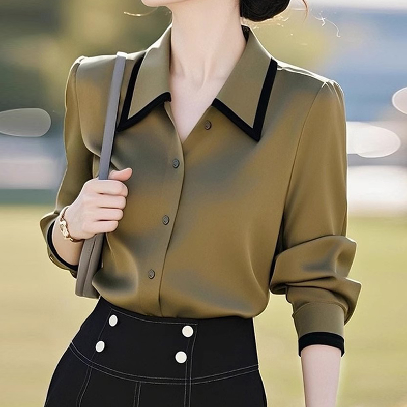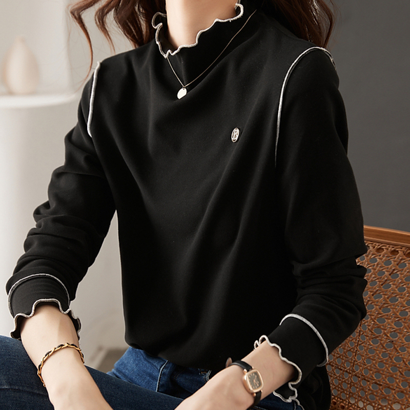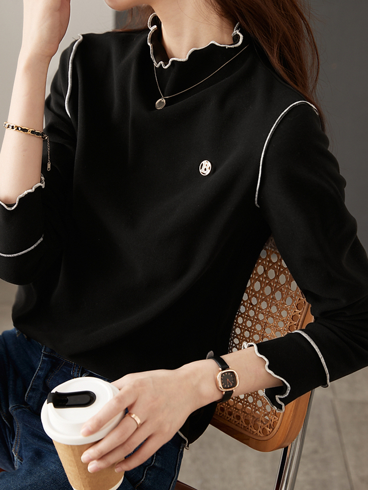 Contrasting color fungus edge black pullover new style women's shirt with sleeves