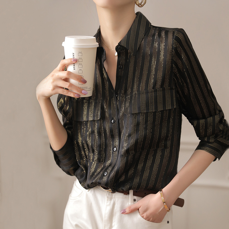Bright silk vertical striped light extravagant long-sleeved blouse