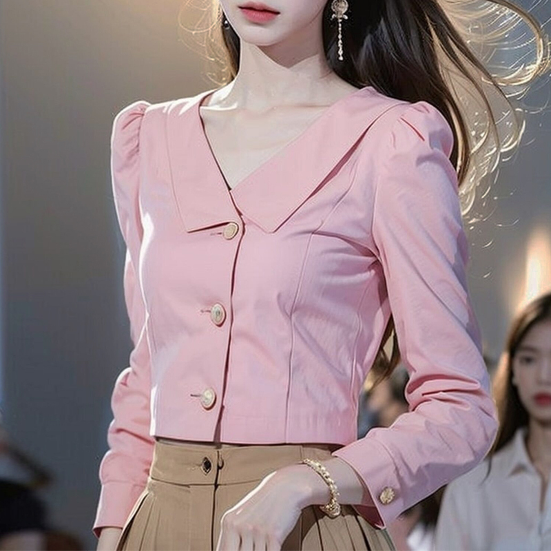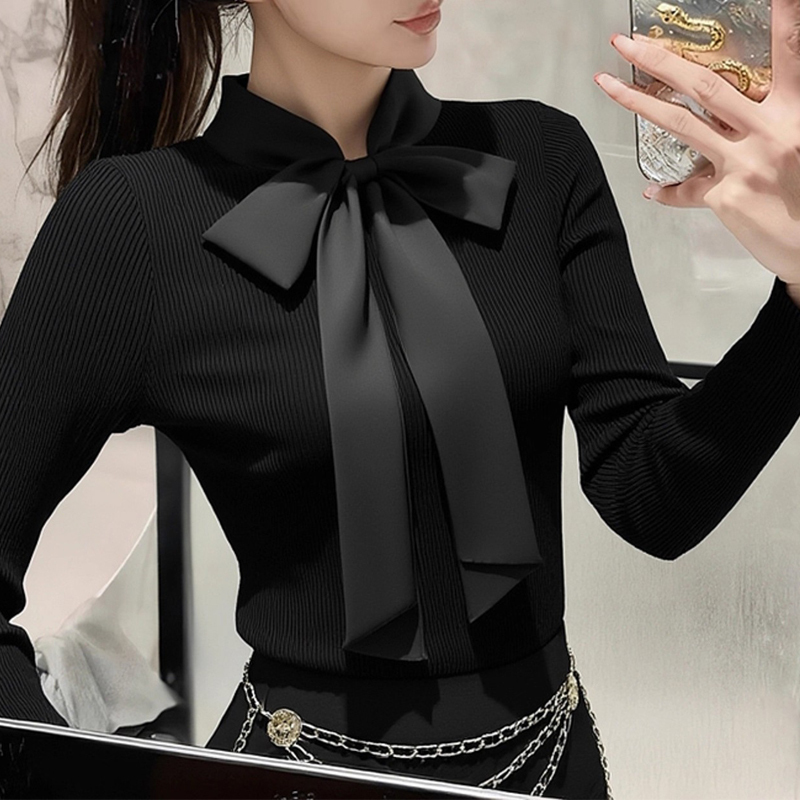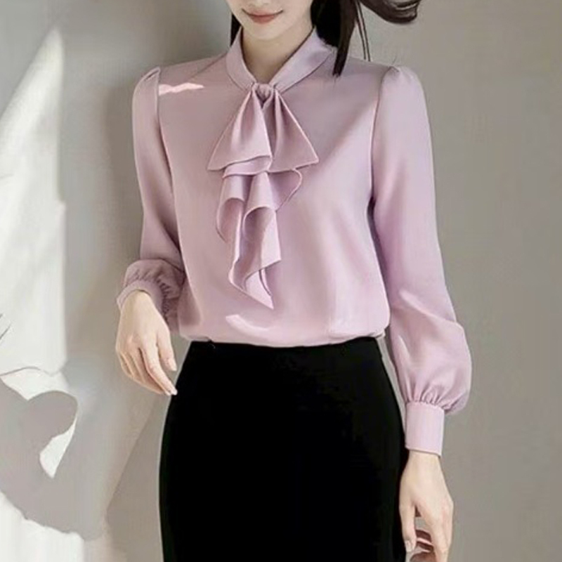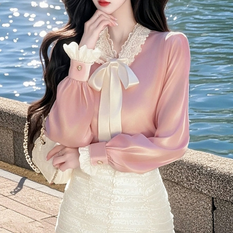 Bow tie lace stitching pink age-reducing sleeves women's shirt