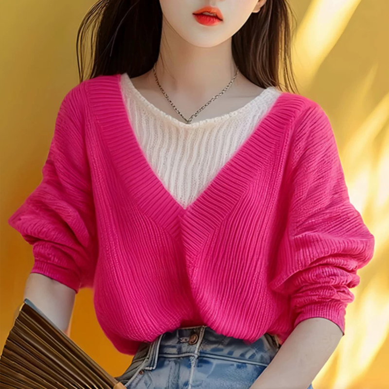 Contrasting color fake two dragon fruit color lazy women's sweater