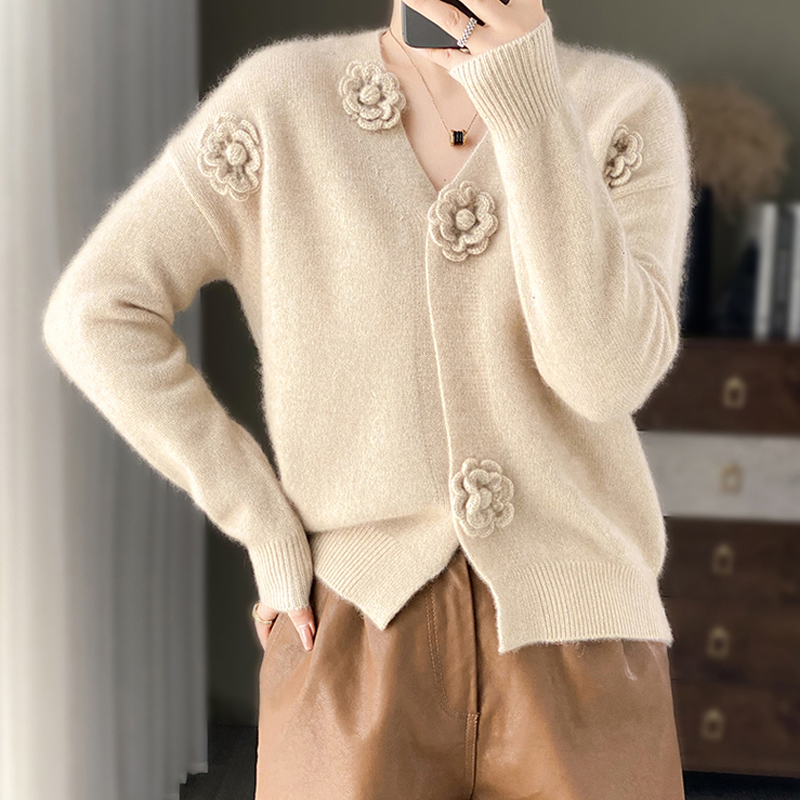 Design three-dimensional hooked V-neck knitted cardigan autumn and winter sleeve knitted sweater