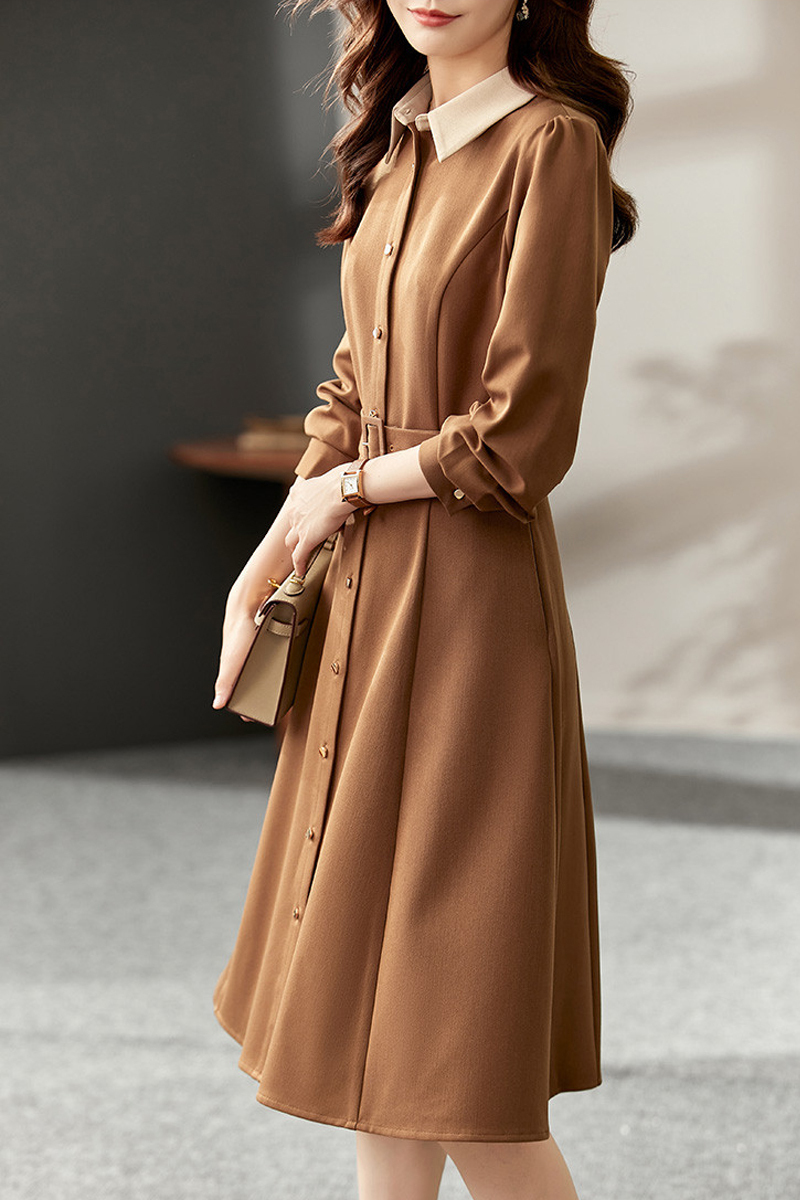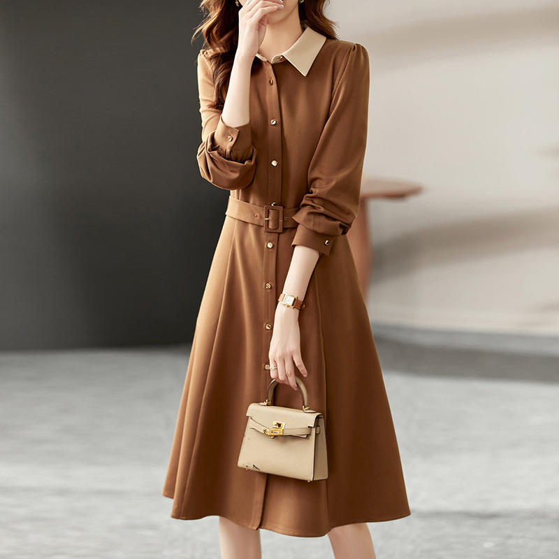 Temperament commuter single-breasted brown long-sleeved shirt skirt