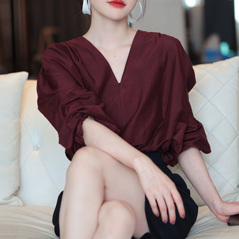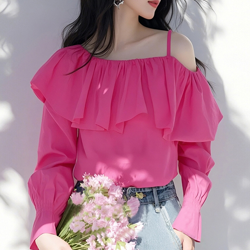 Design off-the-shoulder ruffled rose red sleeve blouse
