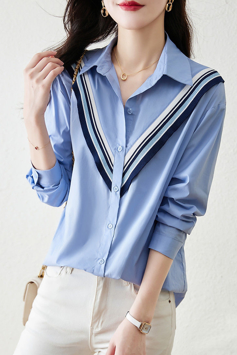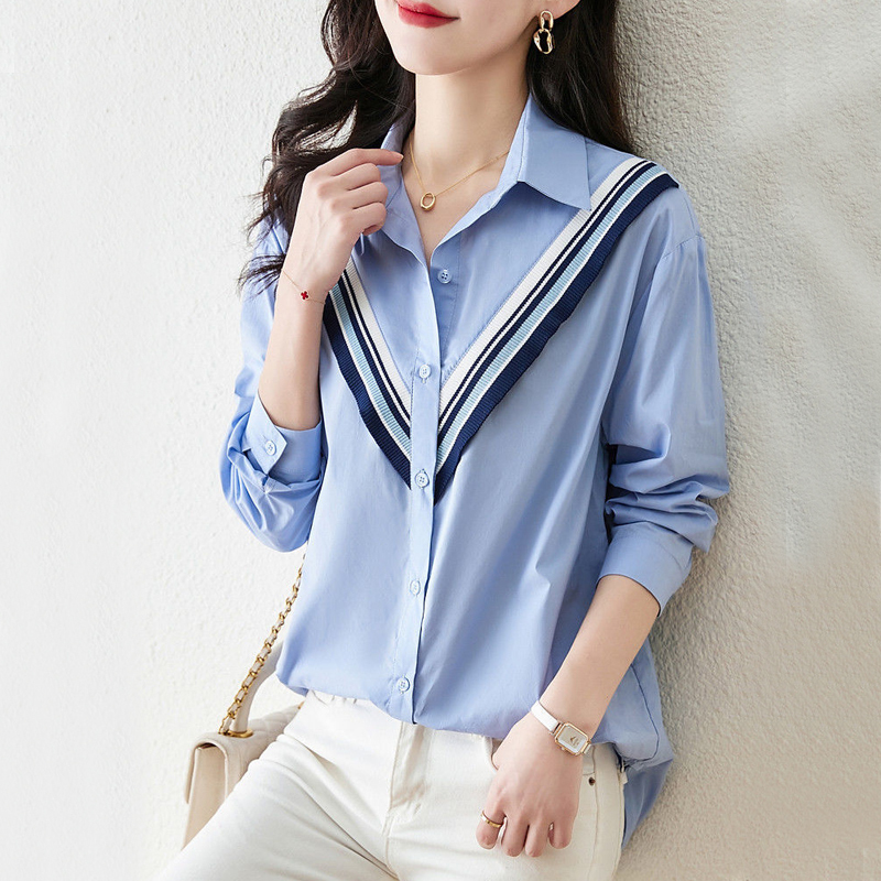 Color collision design sense V-ribbon spliced blue long-sleeved shirt