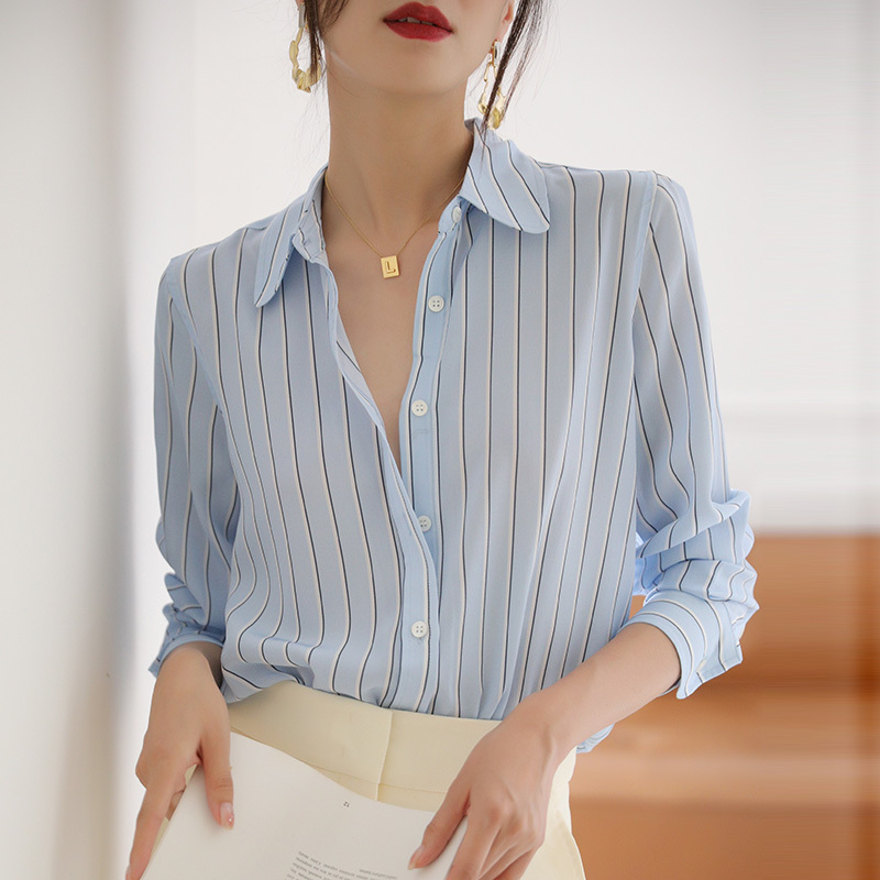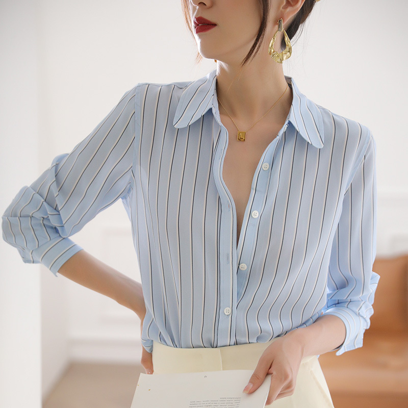 Temperament commuter blue vertical striped long-sleeved lady's shirt