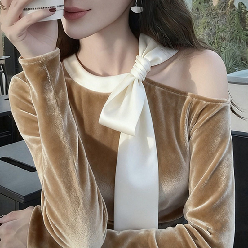 Design Asymmetrical strapless pullover bow tie velvet sleeves blouse