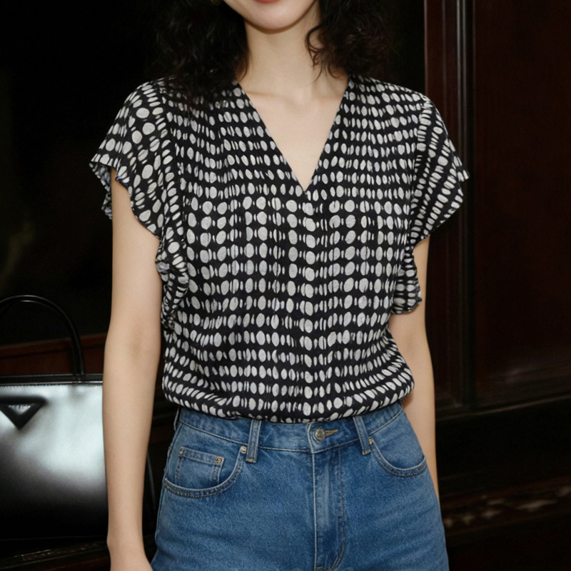 Retro Xiaofei sleeves with wavy dots V-neck summer short new style women's shirt