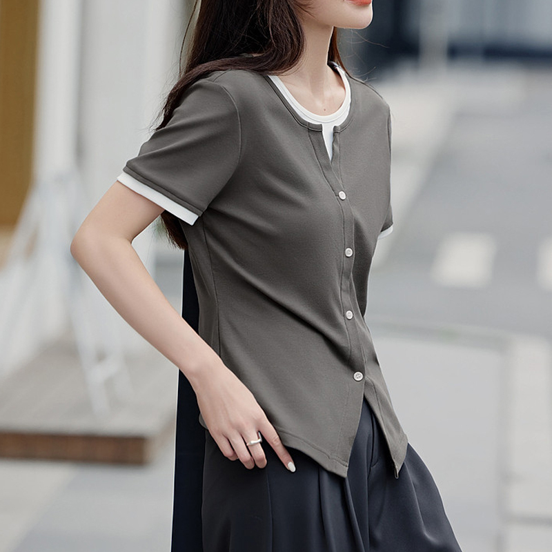 Contrast-color fake two-piece round-collar short-sleeve blouse
