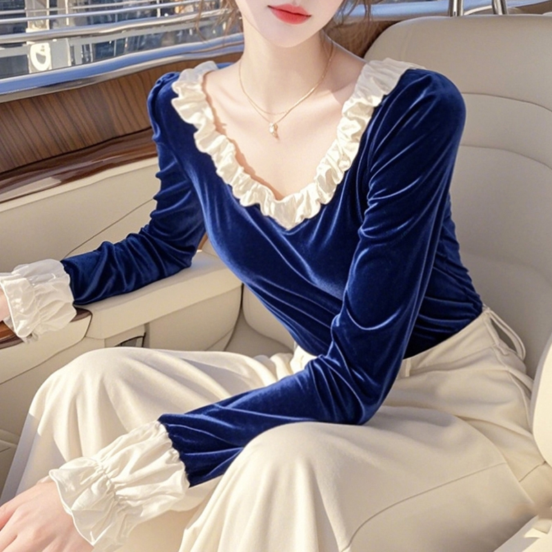 Contrast-color fungus rimmed V-neck blue pullover sleeve blouse