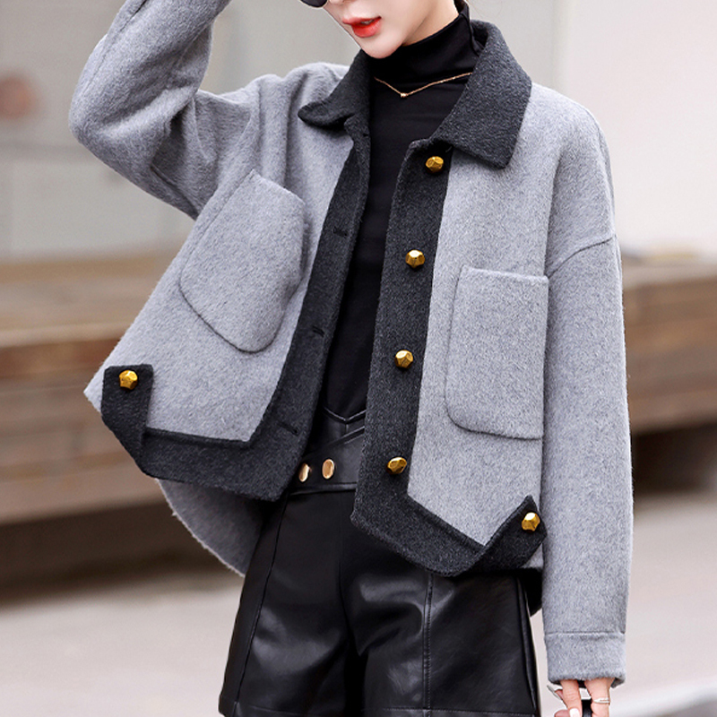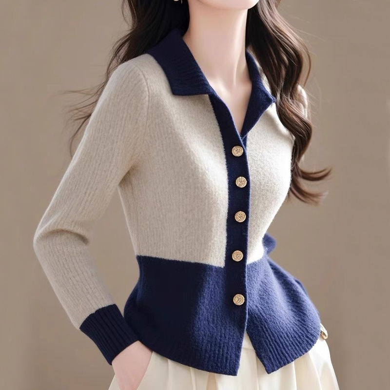 Temperament lapel contrasting color new short-sleeved women's sweater top