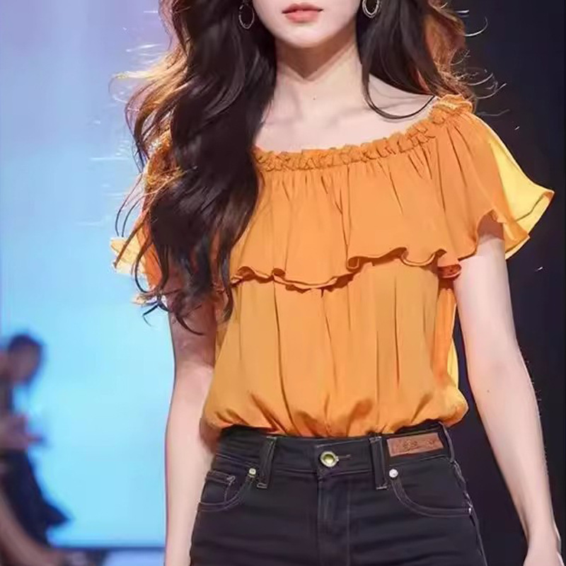 Summer one-shoulder pullover orange flounce short-sleeved shirt
