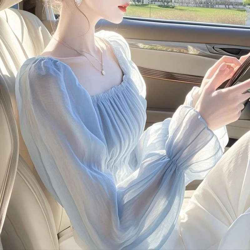 French age-reducing square collar and waist blue pullover sleeve blouse