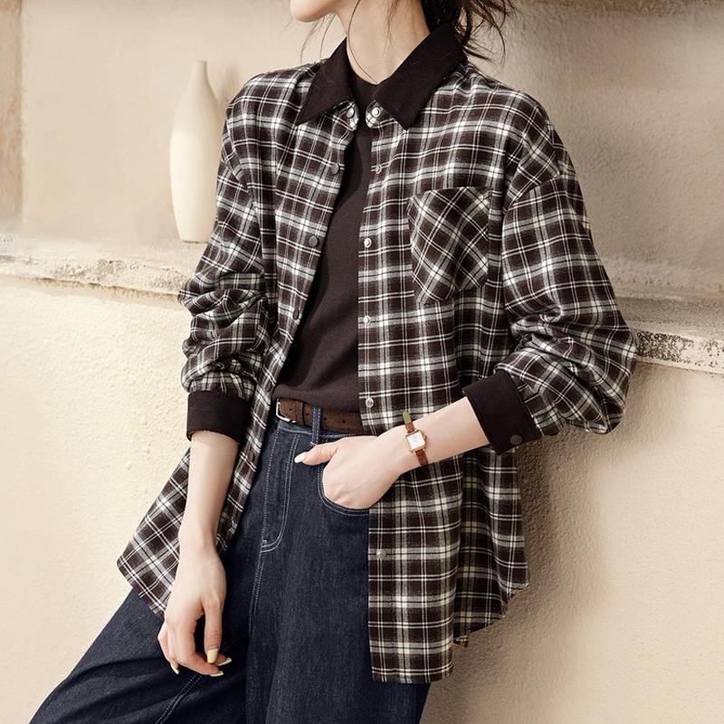 Coffee check casual corduroy autumn and winter sleeve blouse