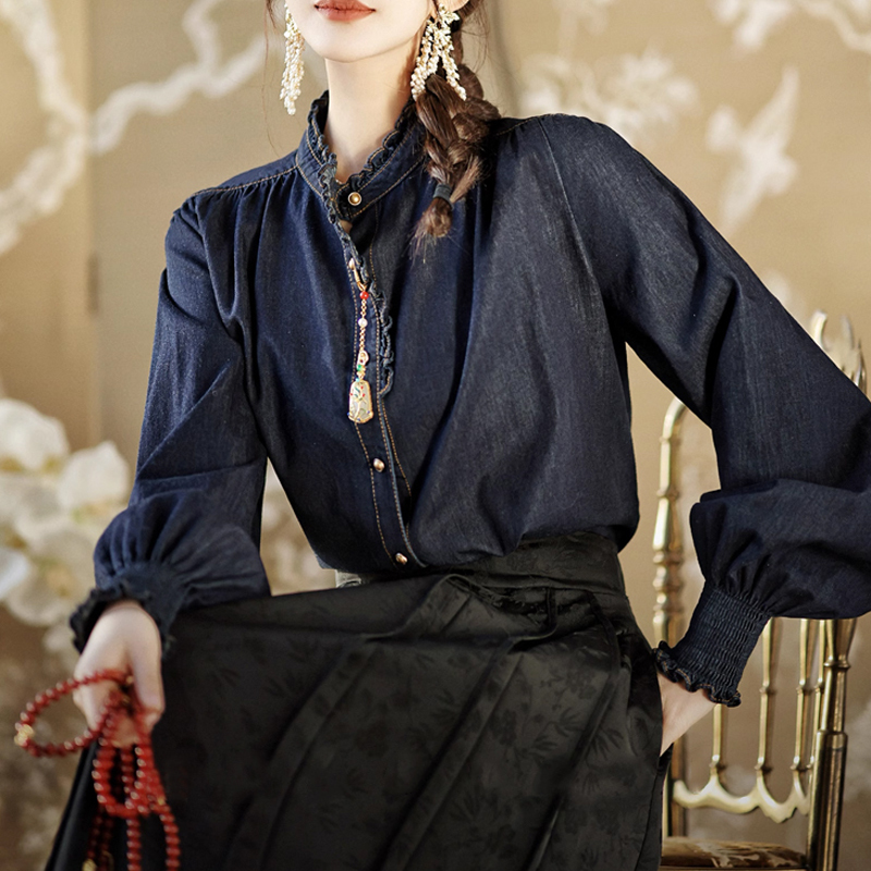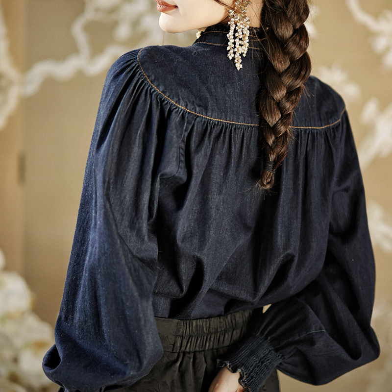 Design sense, fungus edge small stand collar, denim blue coat, sleeves, blouse