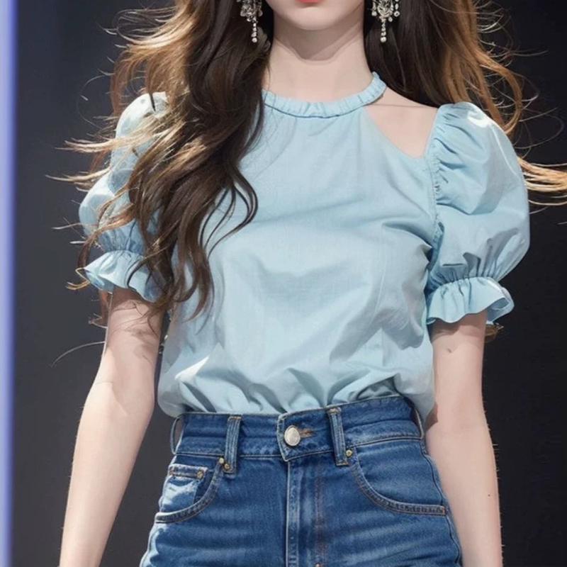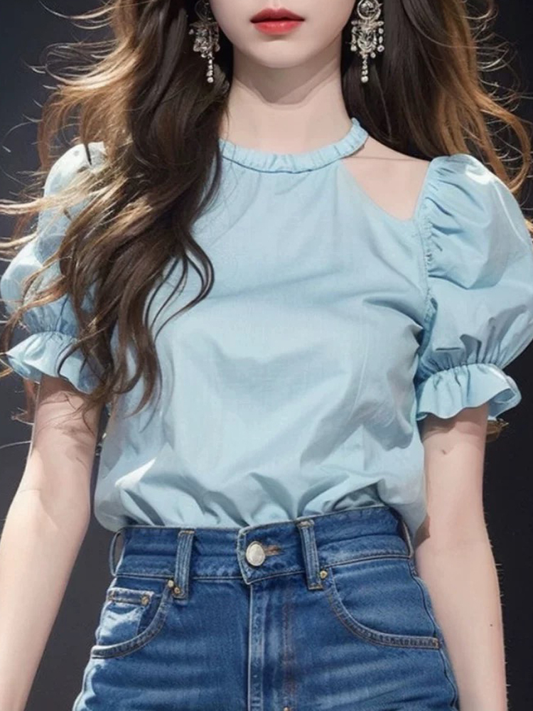 Design Asymmetrical hollow blue pullover short-sleeved shirt