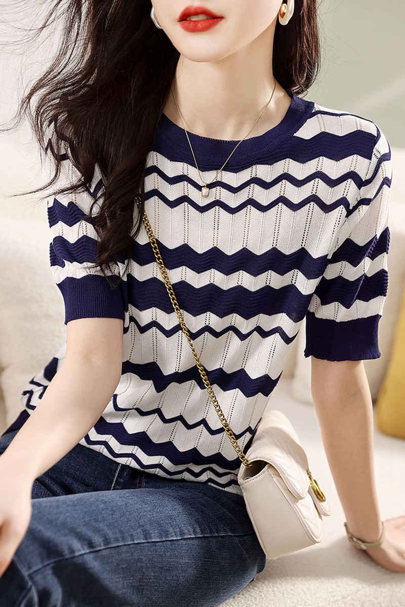 Wavy blue striped pullover sweater with short sleeves