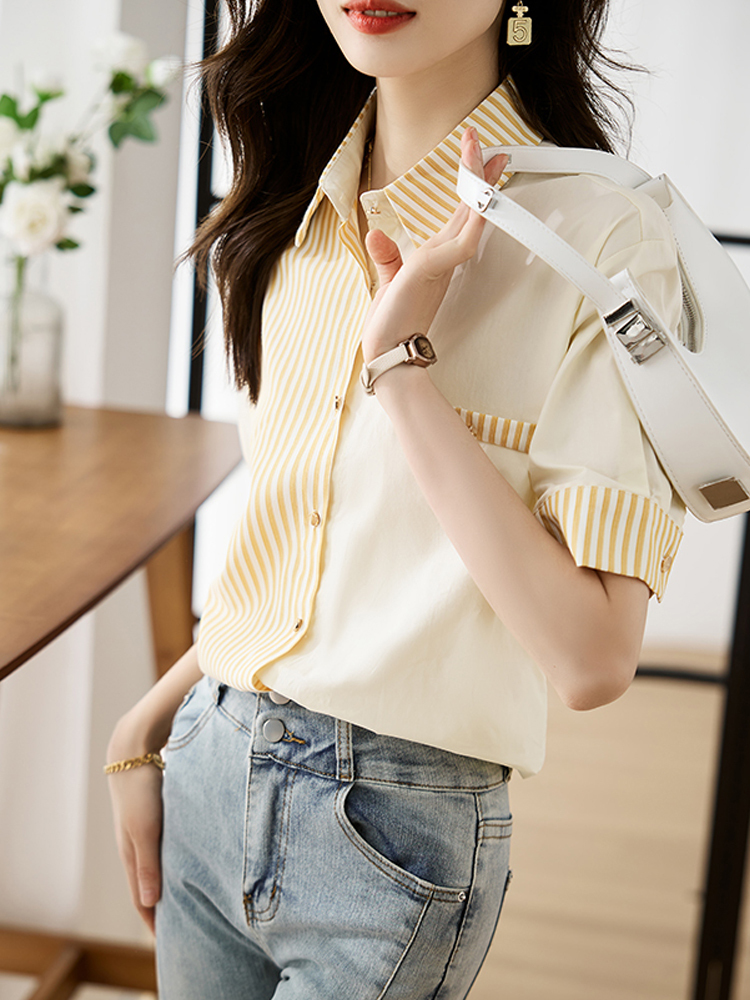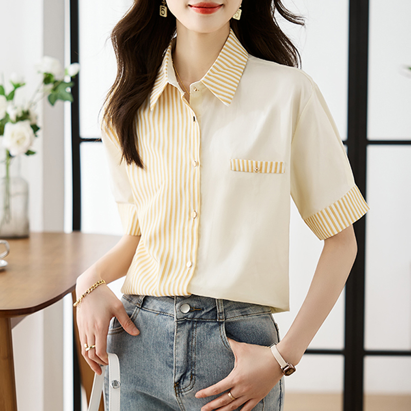 Stripe contrast stitching commuting summer short-sleeved blouse