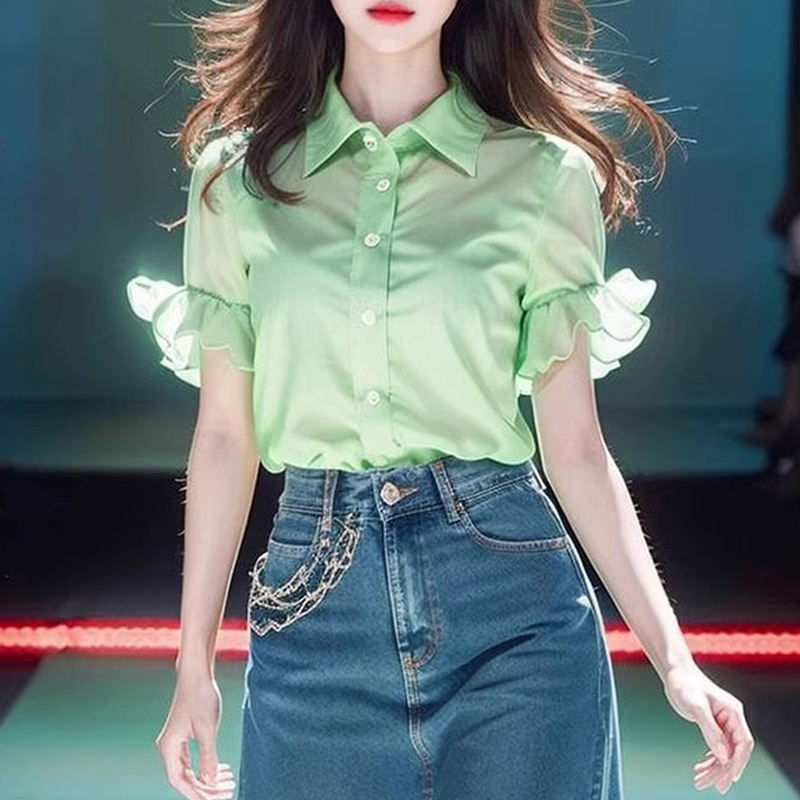 Age-reducing lotus leaf sleeves green youth short-sleeved women's shirt