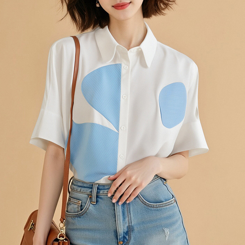 Contrast color geometric pattern loose white short-sleeved blouse