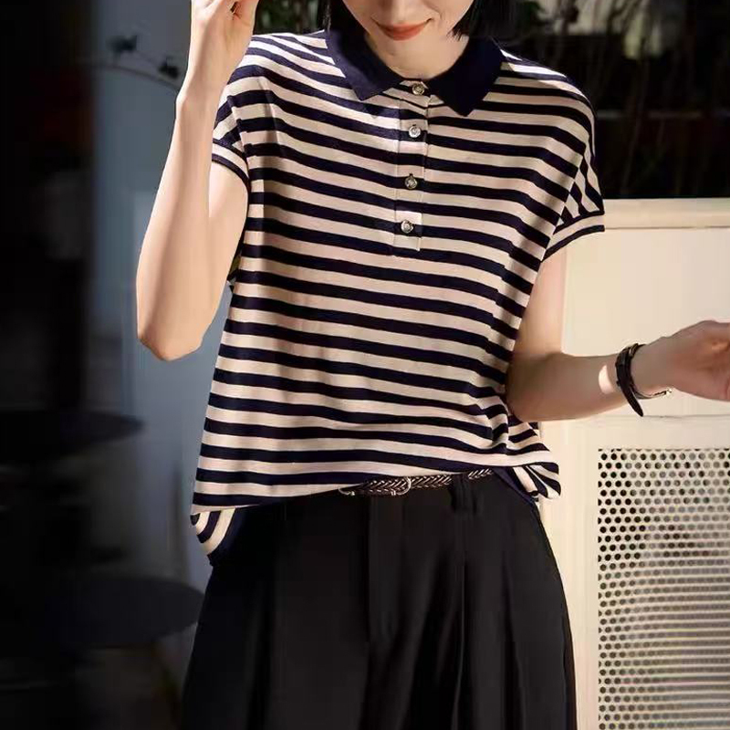 Lapel stripe raglan sleeves loose pullover short-sleeved blouse