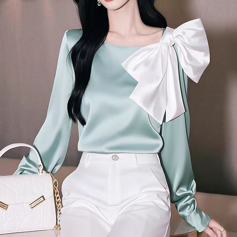Elegant bow decoration green pullover sleeves women's shirt