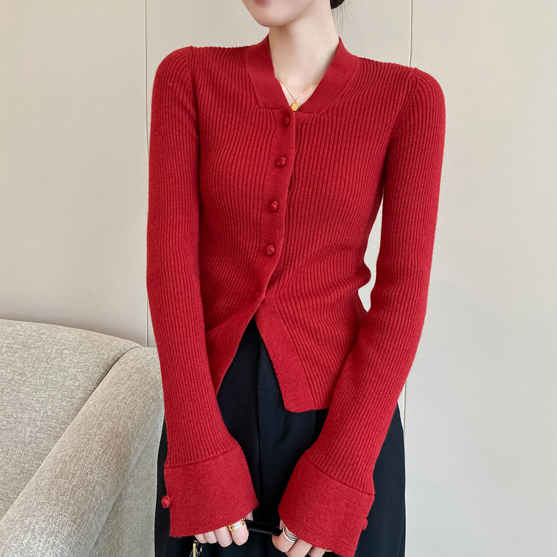 Red V-neck short display retro cardigan sleeve sweater