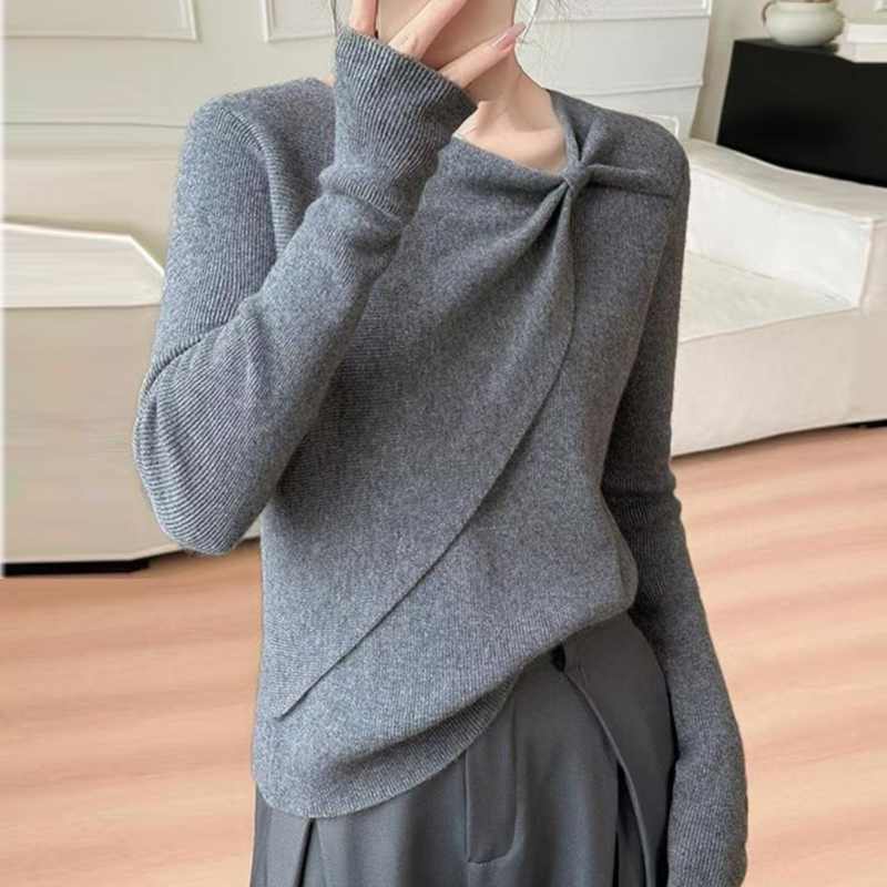 Asymmetrical design neckline, pleated pullover sleeves, women's sweater