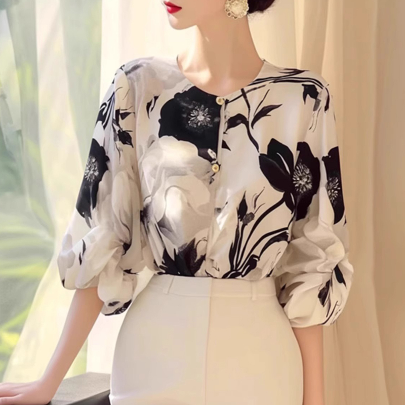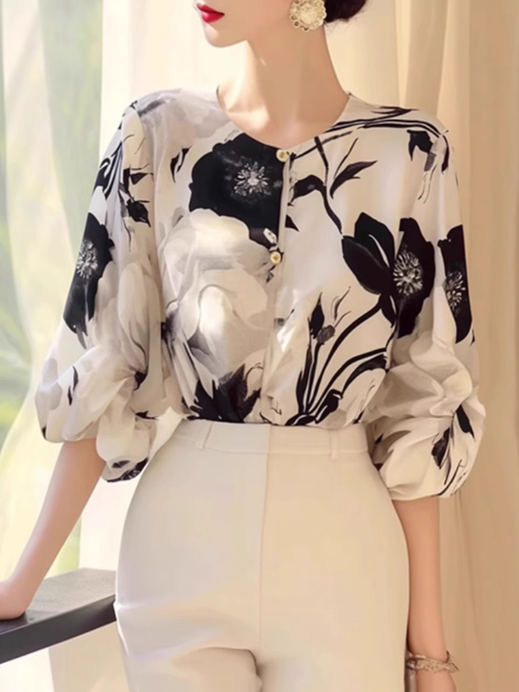 Autumn light mature printed French quarter sleeve new women's shirt