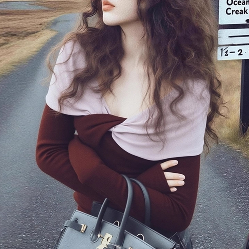 Design sense kink contrasting color stitching red new sleeve women's t-shirt
