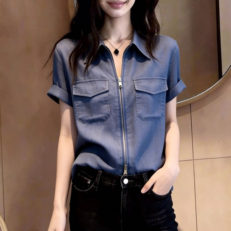 Blue lapel tooling style new short-sleeved women's shirt and top