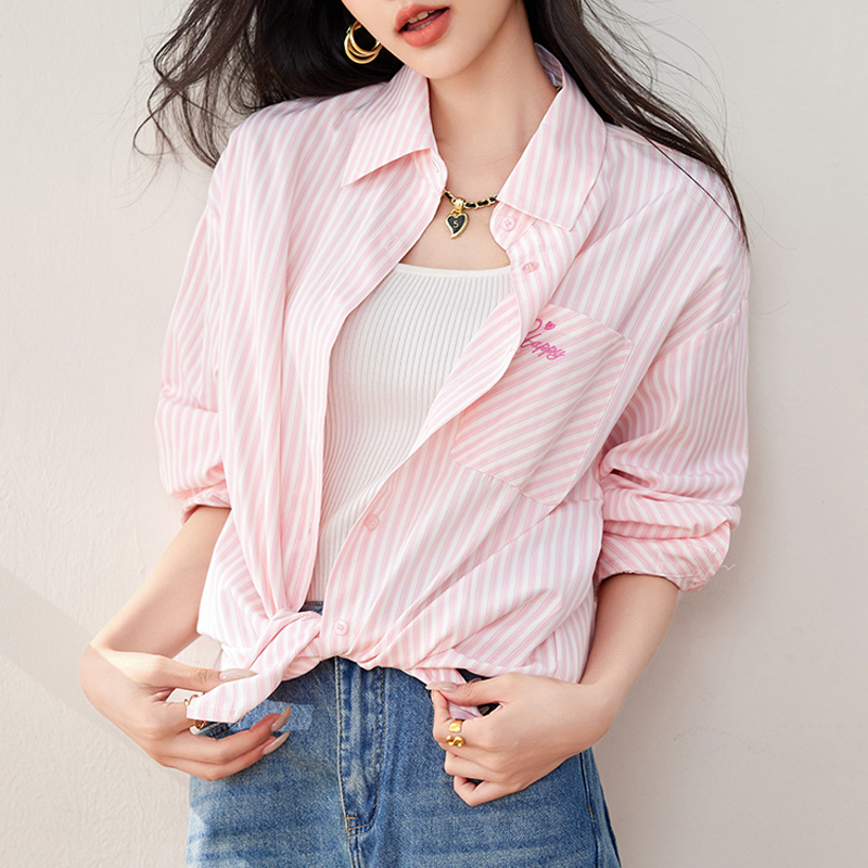 Pink vertical stripe embroidery bag loose shirt