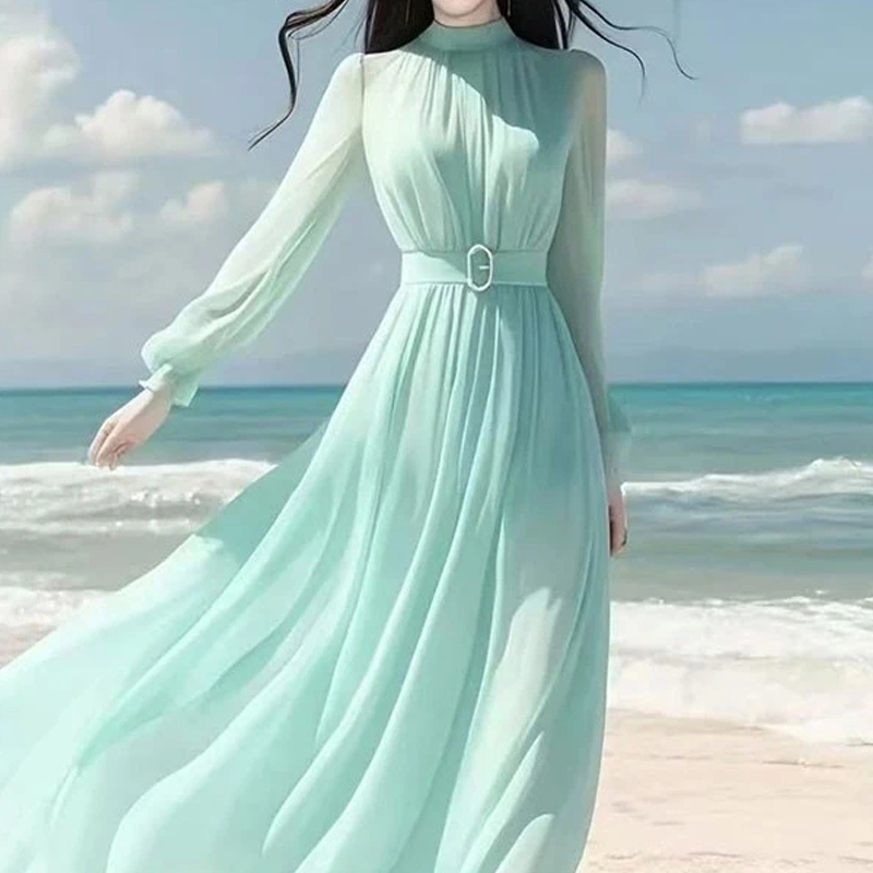 Elegant and gentle spring waist waist long dress sleeve dress