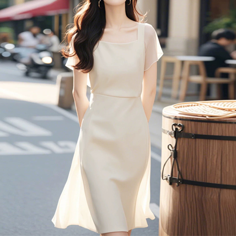 Rice apricot color square collar slim slimming short-sleeved dress dress