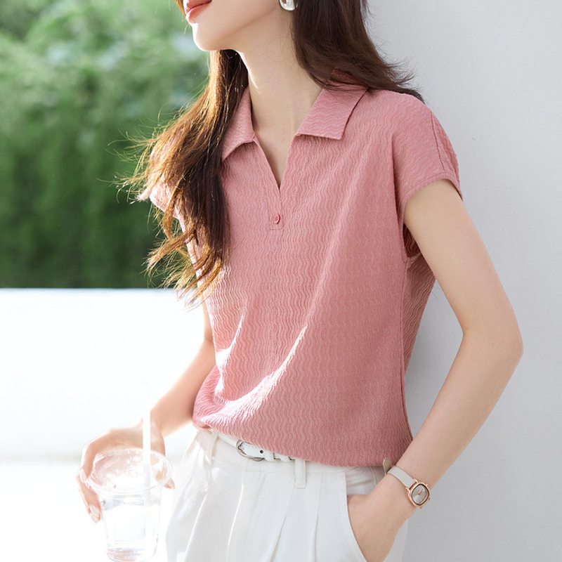 Texture pink lapel pullover raglan sleeves women's shirt