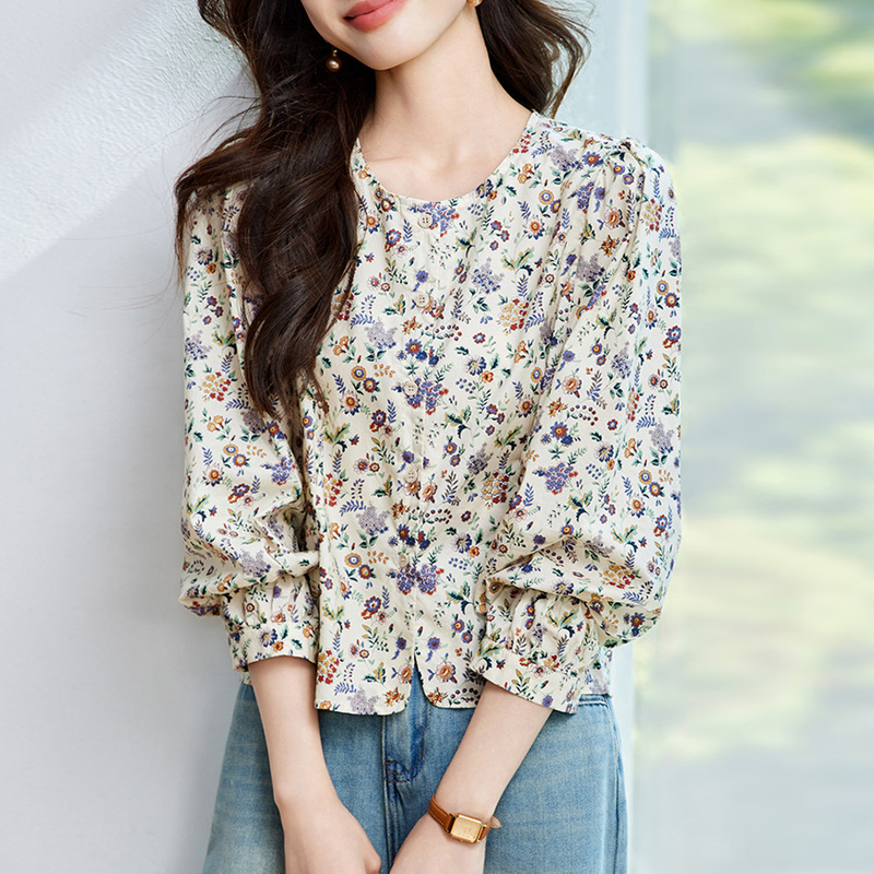 Early autumn short waist, floral farmland style sleeves, women's shirt